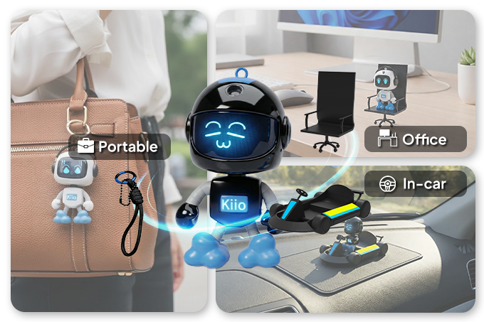 Kiio is more than a device—it's a companion ready for your life on the move. Comes with a detachable lanyard for easy carrying, a secure car mount for hands-free navigation and conversation on the road, and a sleek desk stand for your workspace. Whether you're driving, working, or out exploring, Kiio fits seamlessly into your day.
